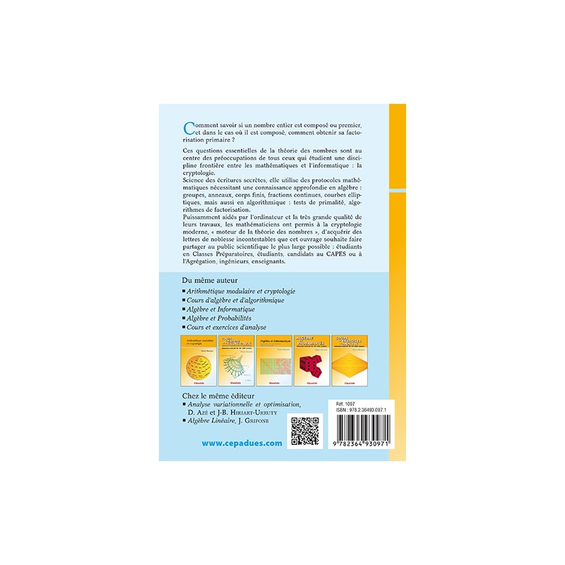 Puissamment aidés par l'ordinateur et la très grande qualité de leurs travaux, les mathématiciens ont permis à la cryptologie moderne, « moteur de la théorie des nombres », d'acquérir des lettres de noblesse incontestables que cet ouvrage souhaite faire partager au public scientifique le plus large possible : étudiants en Classes Préparatoires, étudiants, candidats au CAPES ou à l'Agrégation, ingénieurs, enseignants.