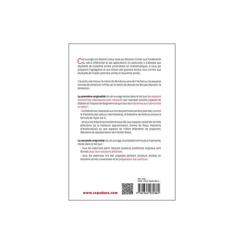 Cet ouvrage est destiné à tous ceux qui désirent s’initier aux fondements du calcul différentiel et ses applications. En particulier, il s’adresse aux étudiants de troisième année universitaire en mathématiques, à ceux qui préparent l’agrégation et aux élèves des grandes écoles, tout comme aux étudiants de master première année et deuxième année.